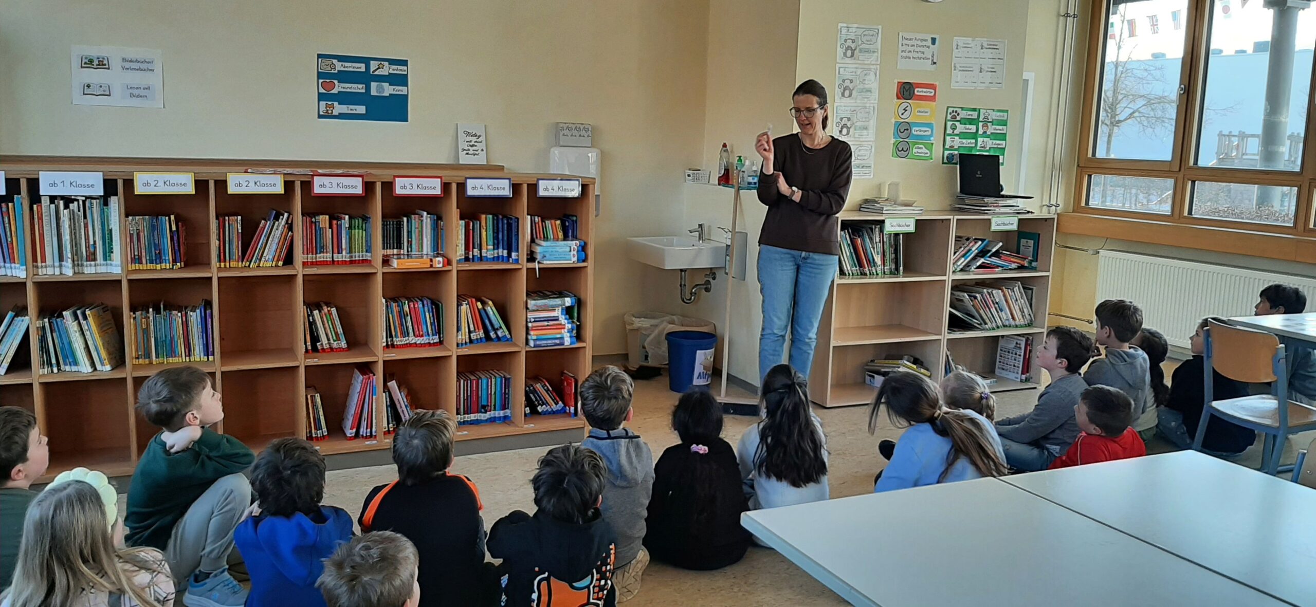 Vor zwei Wochen wurde an unserer Grundschule die Schülerbücherei eröffnet. In den Wochen zuvor hatte Frau Löffler mit viel Engagement alle Bücher sorgfältig sortiert und digital eingescannt, sodass eine übersichtliche Ausleihe möglich ist.